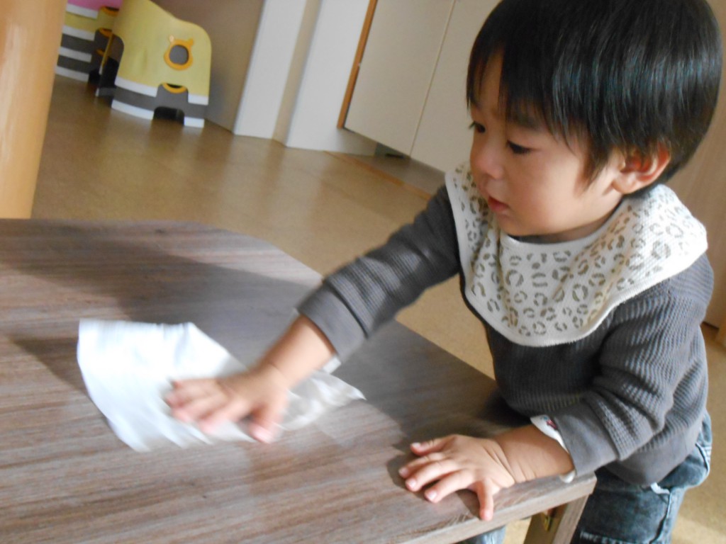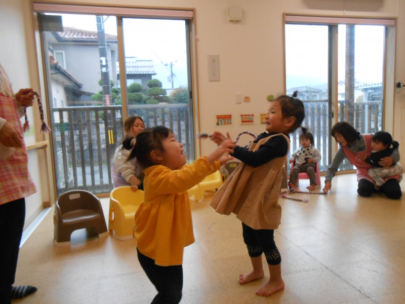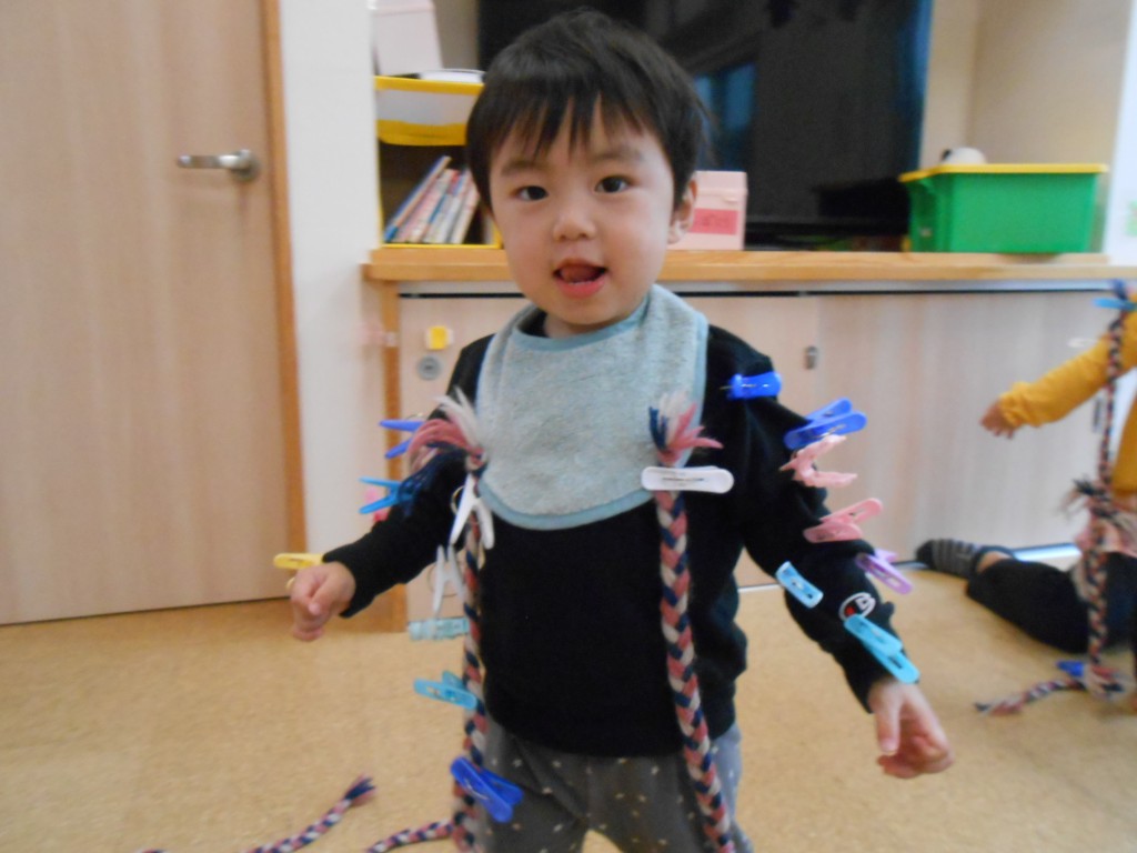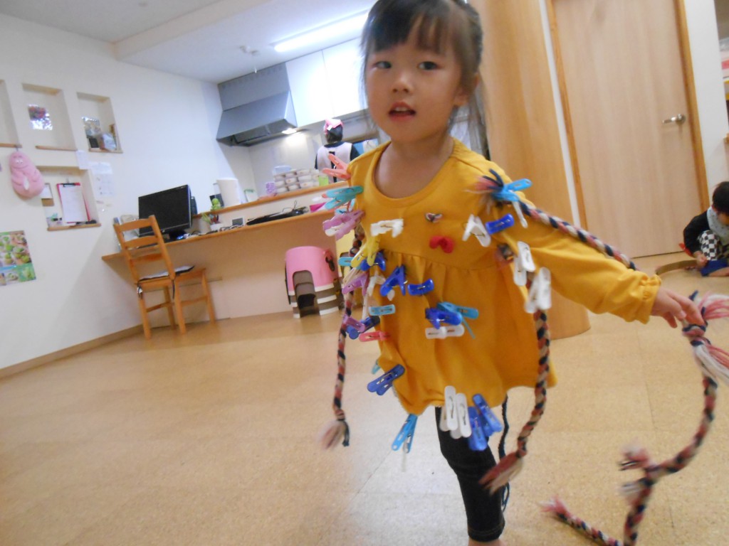 しっぽ取りゲームで使った毛糸のしっぽと洗濯ばさみで