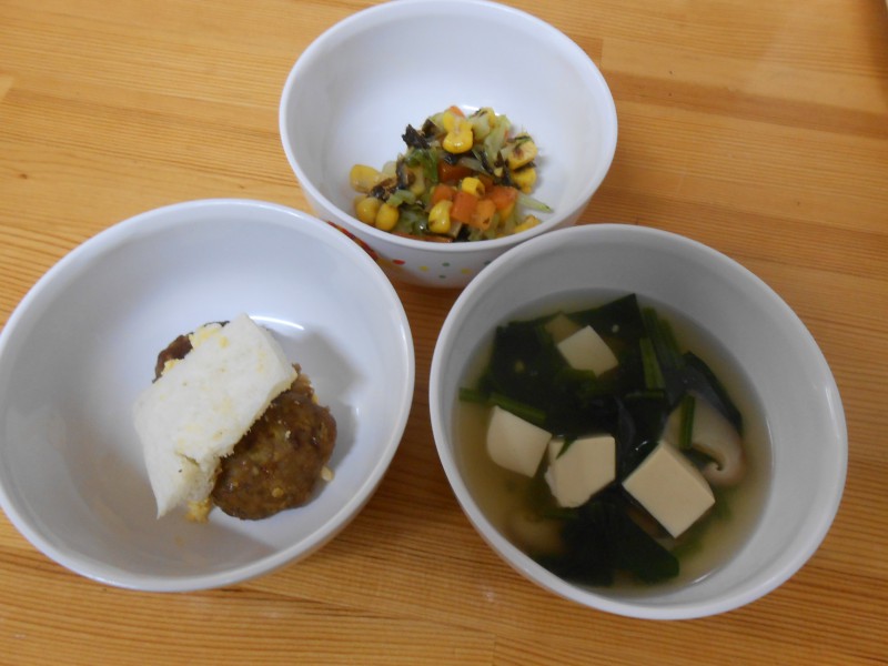 ハンバーグサンドはそのままパクっと食べる子にバラバラにして食べる子に自由に食事を楽しんでいました(^^)/