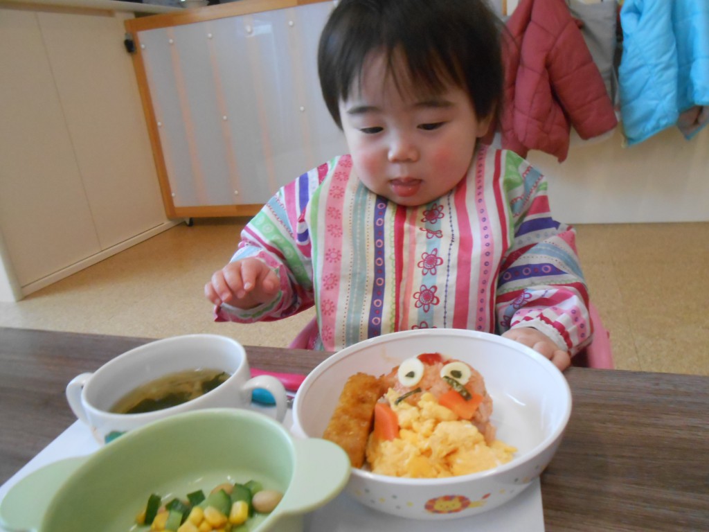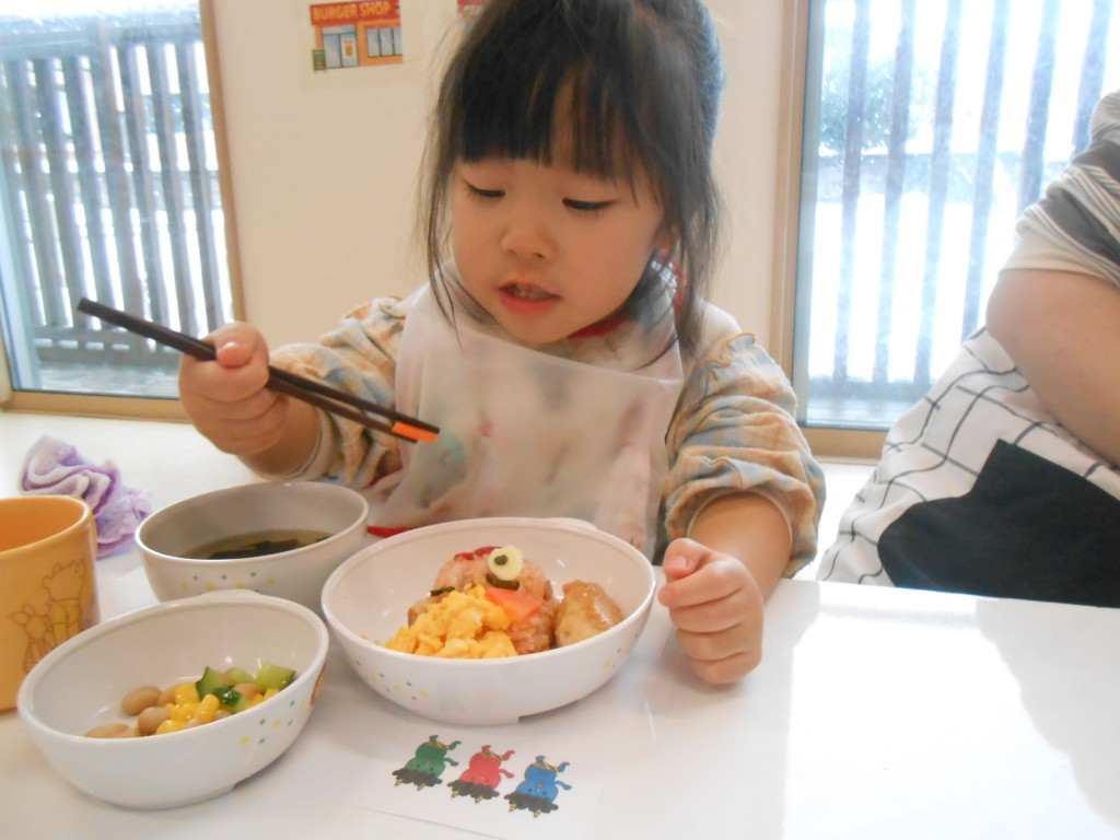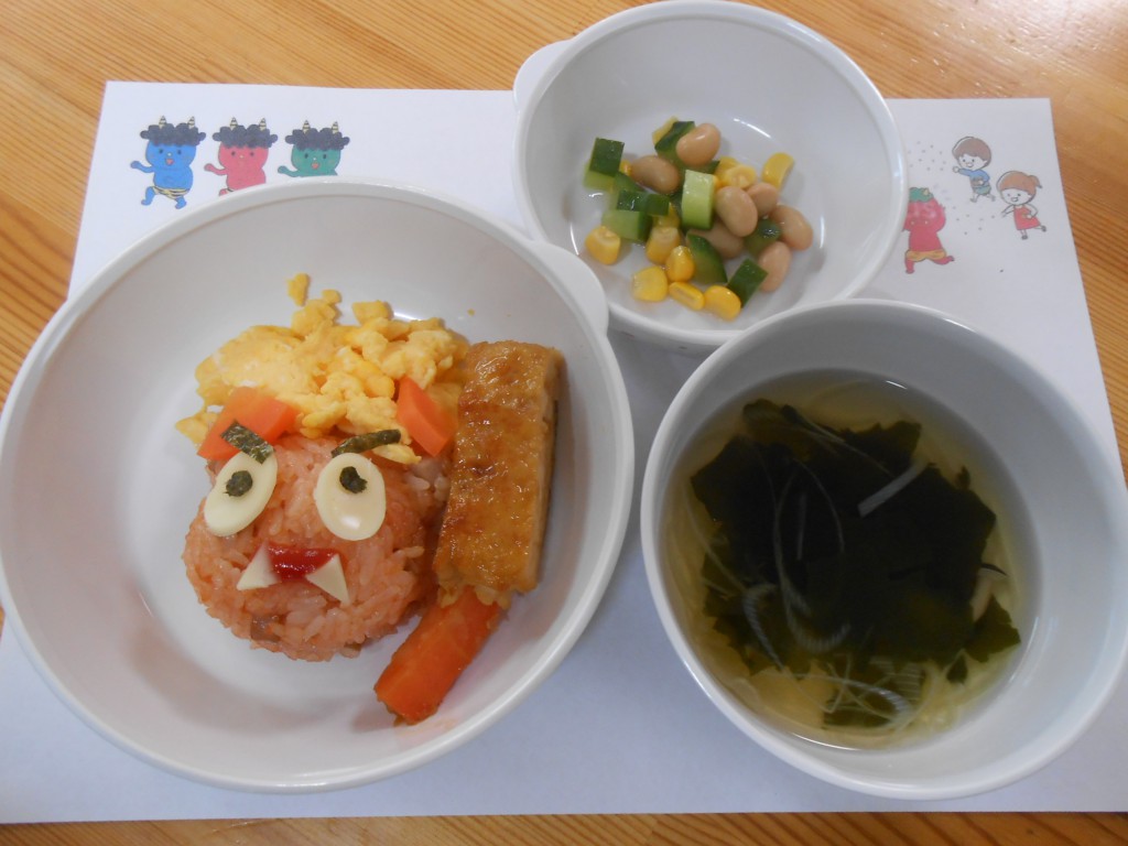 給食にもオニさん登場!みんな好き嫌いせずもりもりたべました。