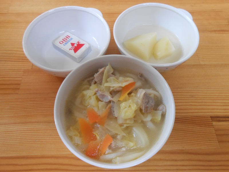 ちゃんぽん麺(うどん、豚肉、人参、玉ねぎ、キャベツ、干し椎茸、牛乳)