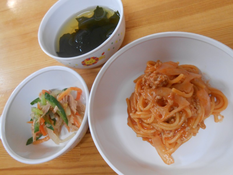 スパゲティ(スパゲティ、豚肉、玉ねぎ、れんこん、トマトジュース)